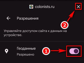 Установите "Геоданные" в значение "Разрешить" и закройте настройки, нажав на крестик
